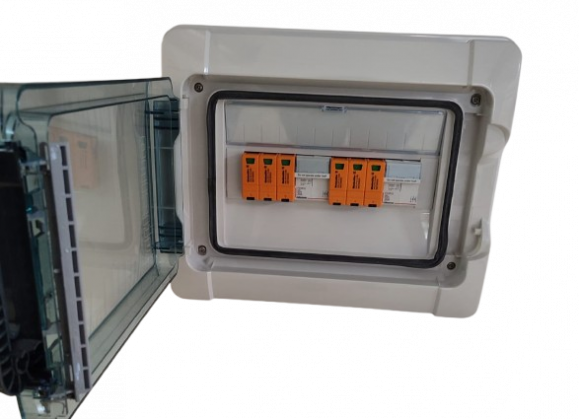 Quadro elettrico di protezione “BTICINO” 2 stringhe 600V precablato specifico per proteggere l'impianto fotovoltaico lato pannelli fotovoltaici da cortocircuiti e scariche tensioni.