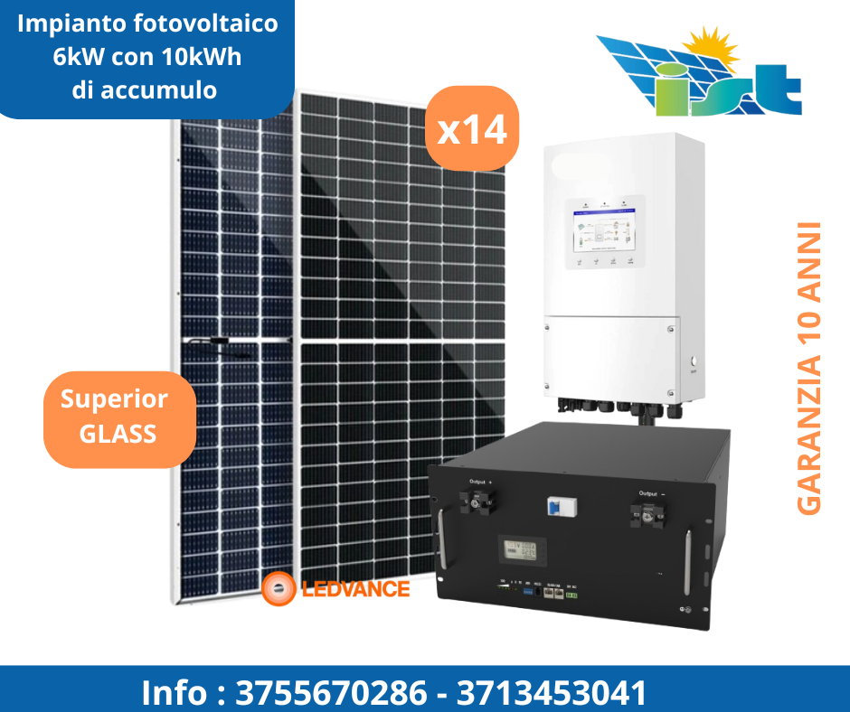 - n 1 inverter ibrido monofase da 6kW Doppio MPPT, CEI 0-21, Schermo LCD, WiFi e TA Inclusi marchio SOLIS con 10 anni di garanzia